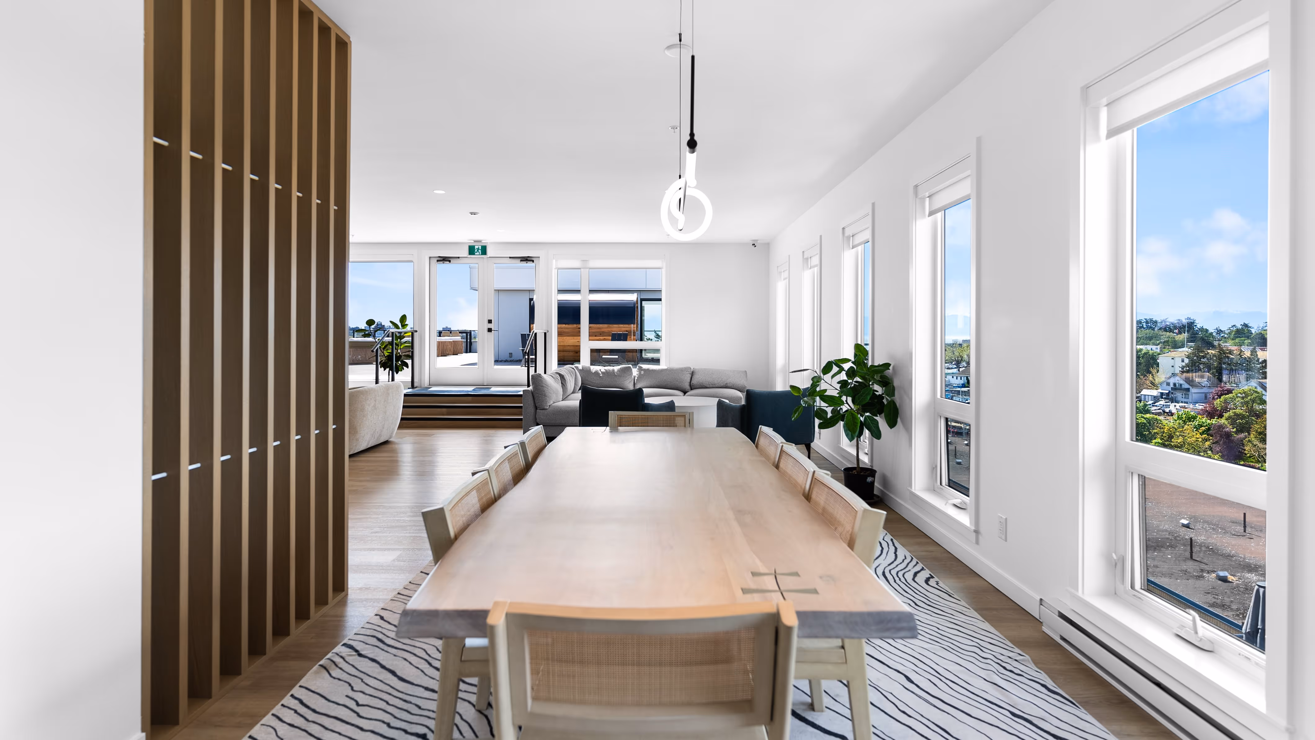 Building amenities include a rooftop terrace overlooking the harbor, a barrel sauna, and gathering spaces.